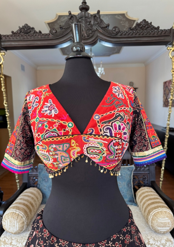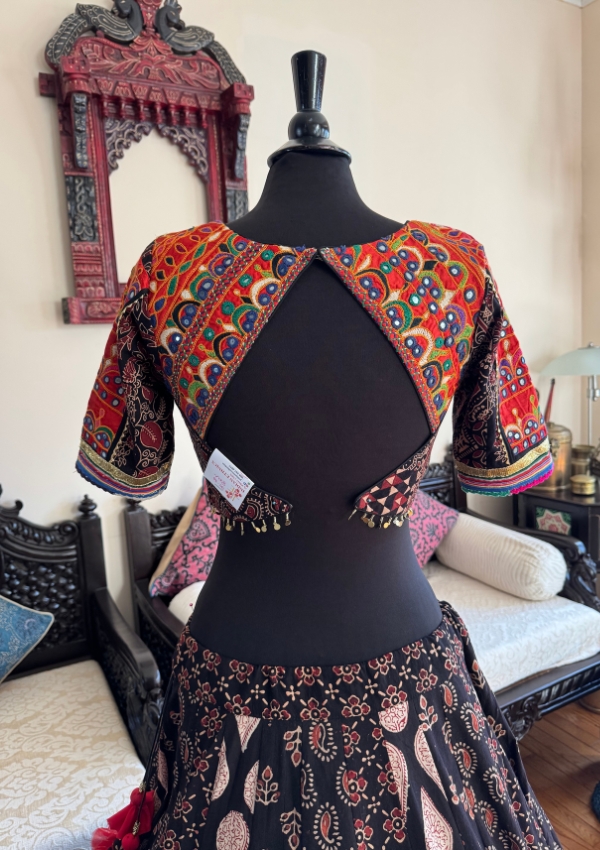 Enhance your festive wardrobe with this Black Block Print Chaniya featuring an 8-meter flare for a grand traditional look. Paired with a classic Gamthi blouse (sizes 34/36) and a rich red vintage dupatta, this ensemble is perfect for Navratri Garba and cultural occasions.