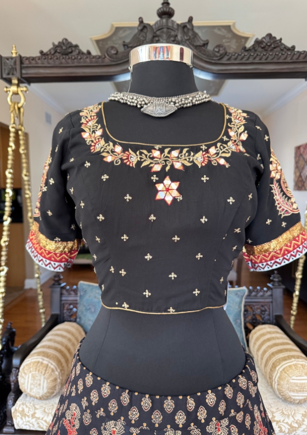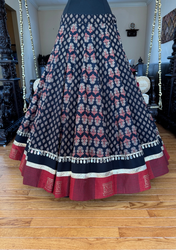 Celebrate tradition with this Black Block Print Chaniya featuring an 8-meter flare and mirror border. Paired with a silk embroidered blouse (sizes 38/40/42) and a georgette dupatta with Gamthi border, this ensemble is designed to radiate elegance and festive spirit during Navratri Garba nights.