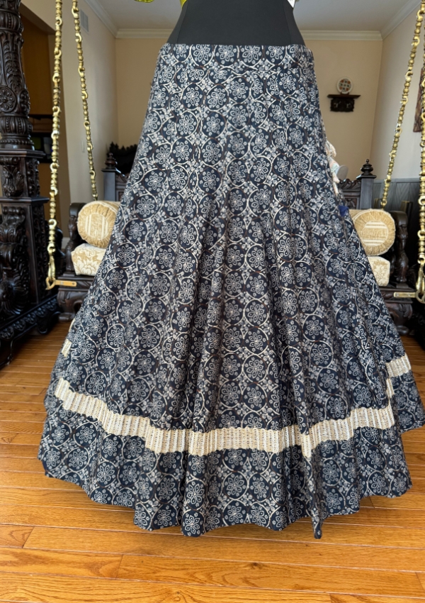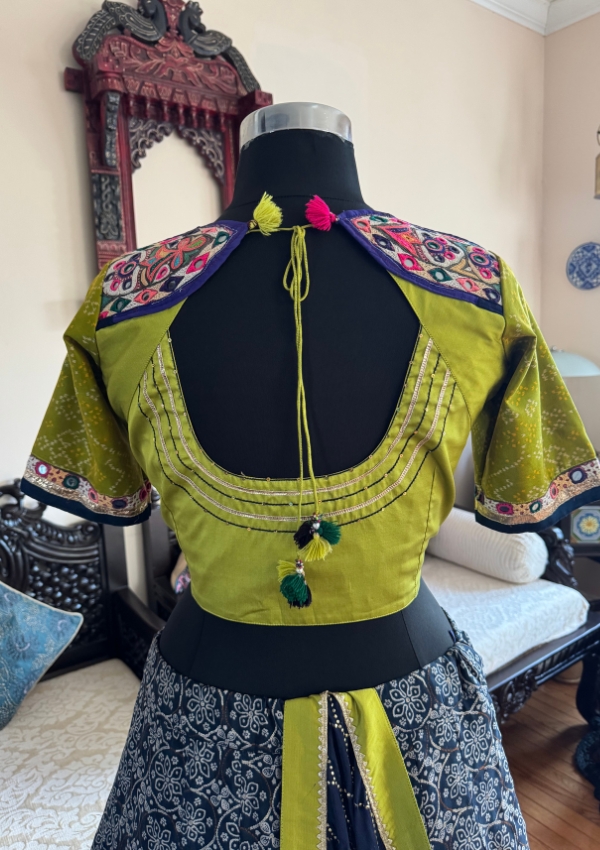 Elevate your festive look with this Blue Bhagalpuri Chaniya designed with traditional craftsmanship. Paired with a parrot green silk Gamthi border blouse (sizes 42/44/46) and a soft georgette dupatta, this outfit perfectly blends comfort and elegance, making it ideal for Navratri Garba nights.