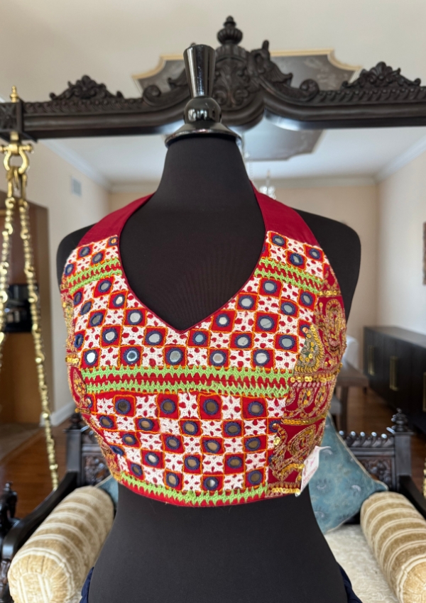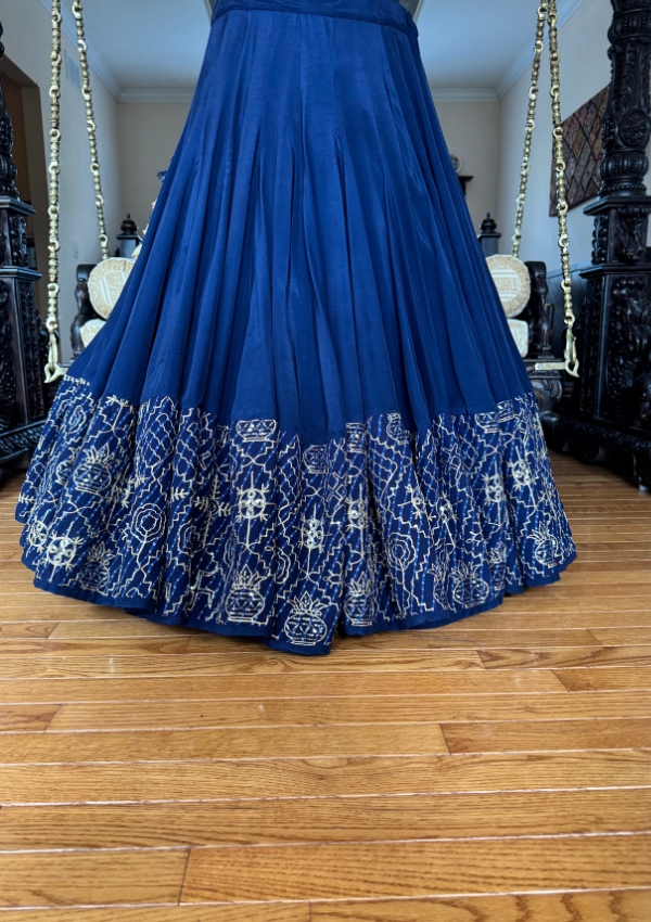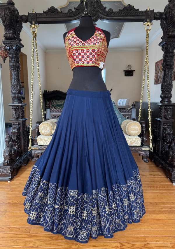 Make a statement with this Blue Chaniya featuring an 8-meter flare and elegant vintage border. Paired with a maroon halter-style Gamthi vintage blouse and a maroon georgette dupatta, this ensemble exudes timeless grace and festive charm, perfect for Navratri Garba nights.