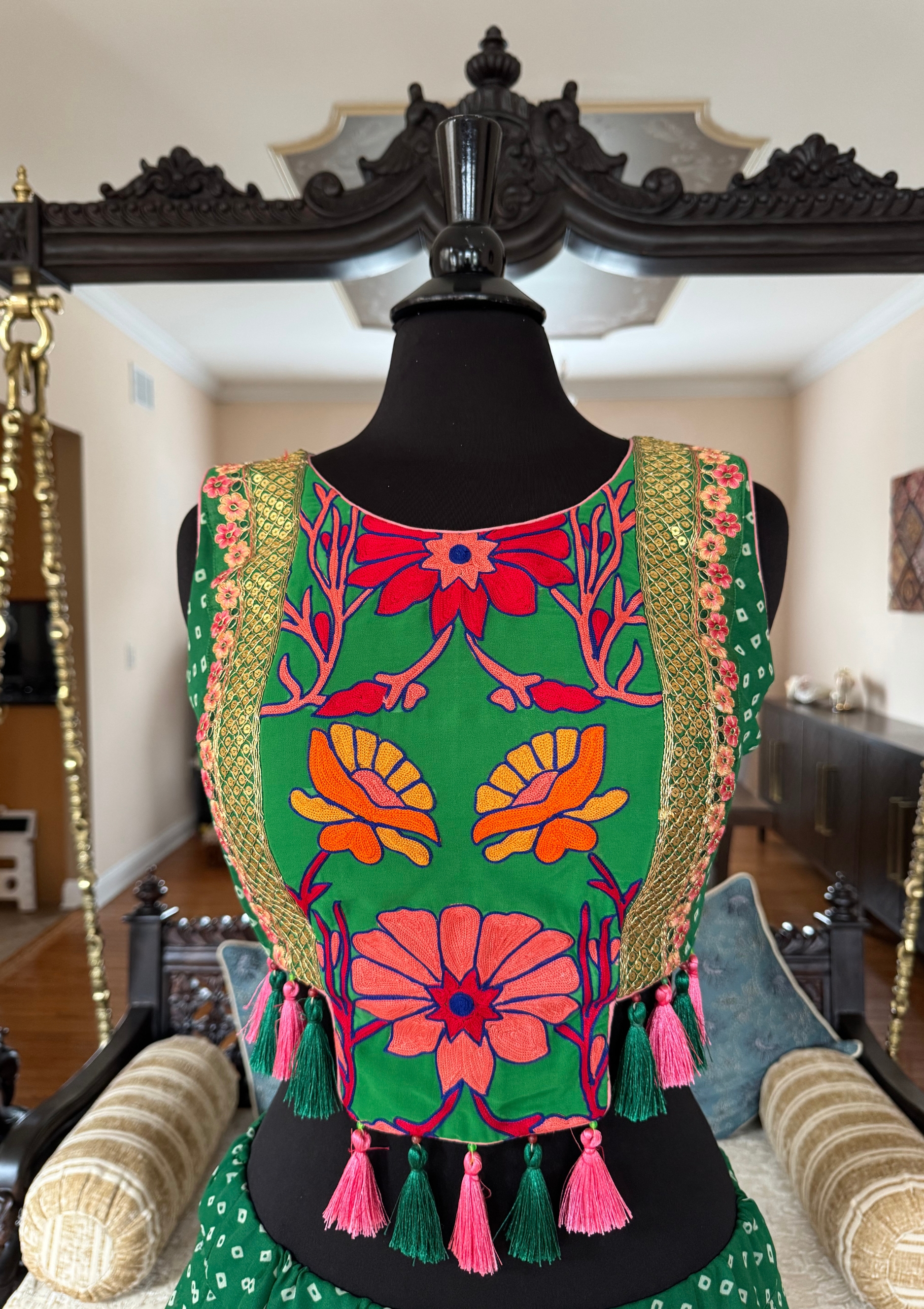 ✨ 8-meter flare green bandhej chaniya with vibrant design
