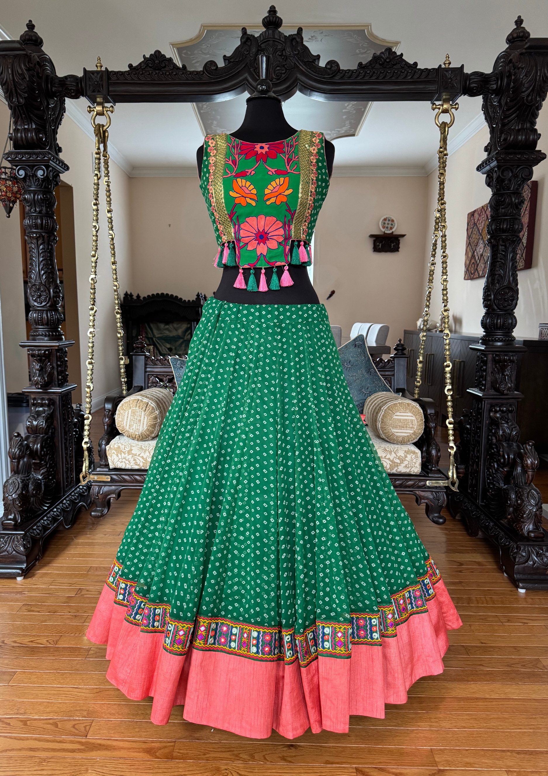 A classic Navratri chaniya featuring an 8-meter flare in green bandhej, paired with a delicate aari work embroidered blouse and an elegant peach dupatta with banarasi border. A perfect blend of tradition and festive elegance.