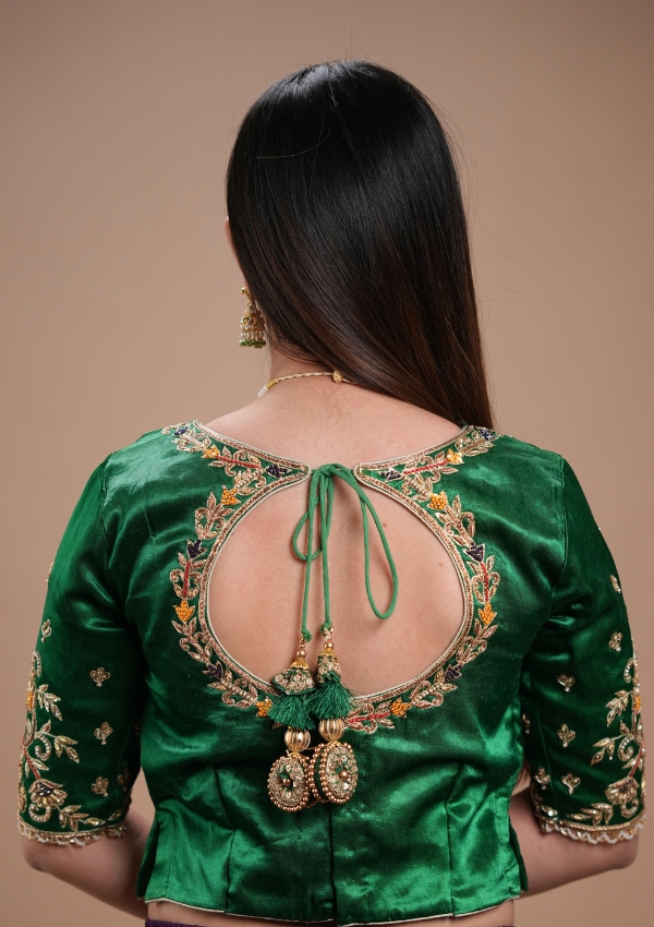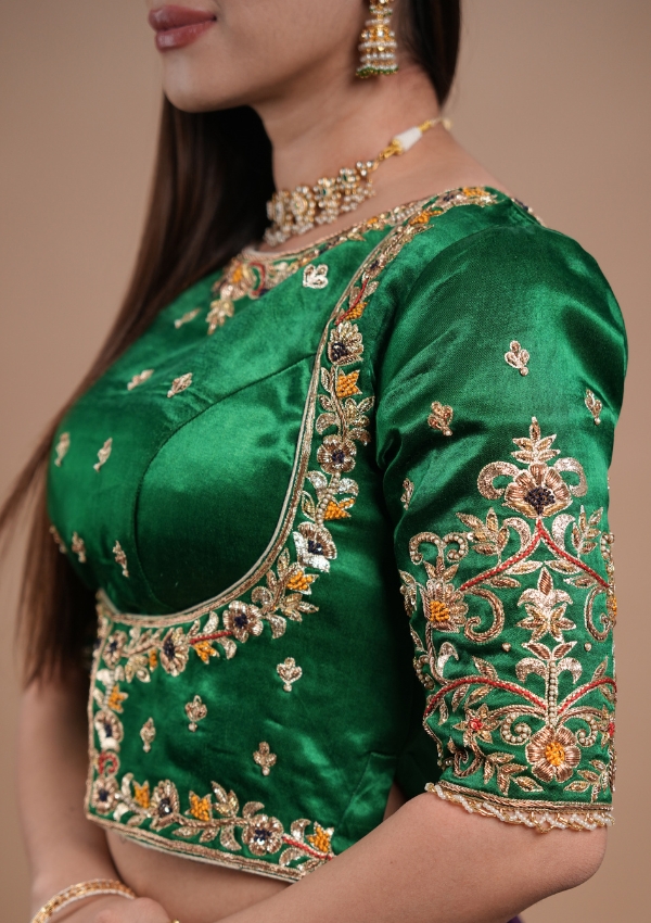 This green gajji silk blouse features rich zardosi and pearl hand embroidery, crafted for a royal and elegant look. Designed in a high neckline style with elbow sleeves and intricate all-over work, it includes a stylish front slit for a modern touch. Perfect to pair with sarees or lehengas for weddings and festive occasions.
