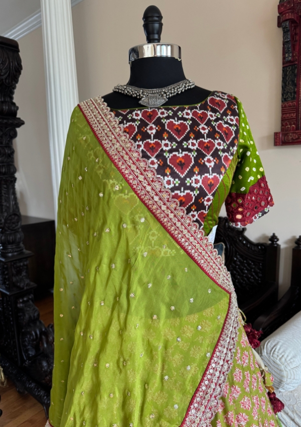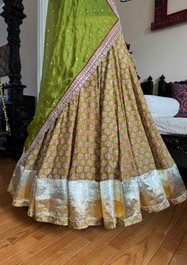Grace your Garba nights in this green lehenga with pink floral motifs, styled with a vibrant contrast blouse and delicate zari border. The sheer green dupatta completes this elegant festive look.