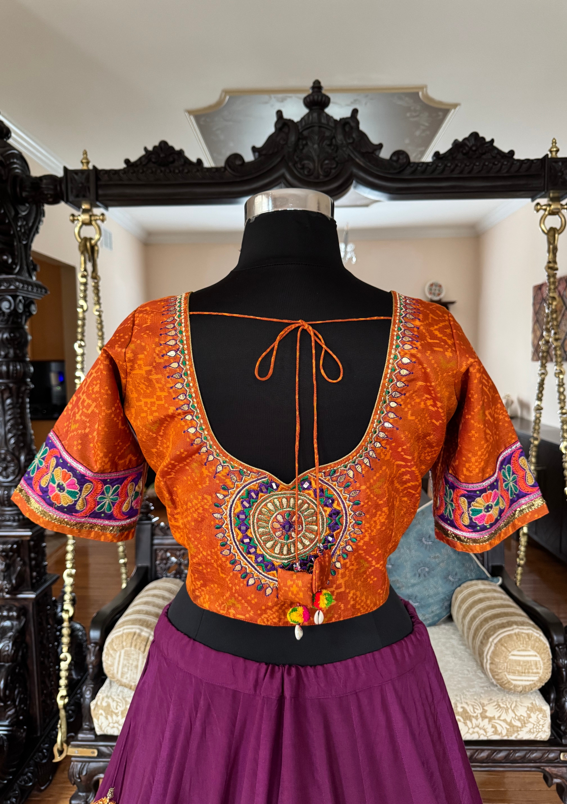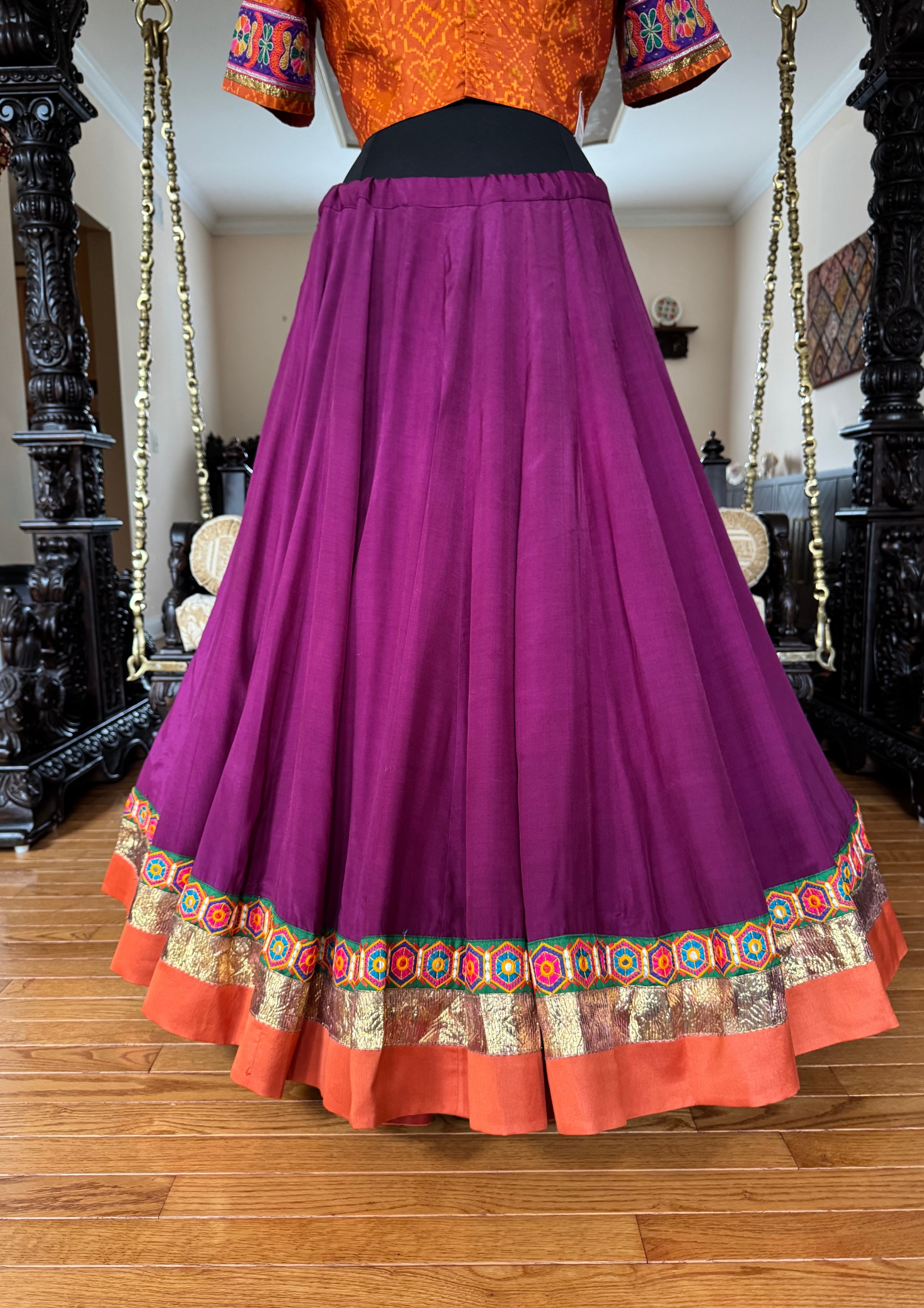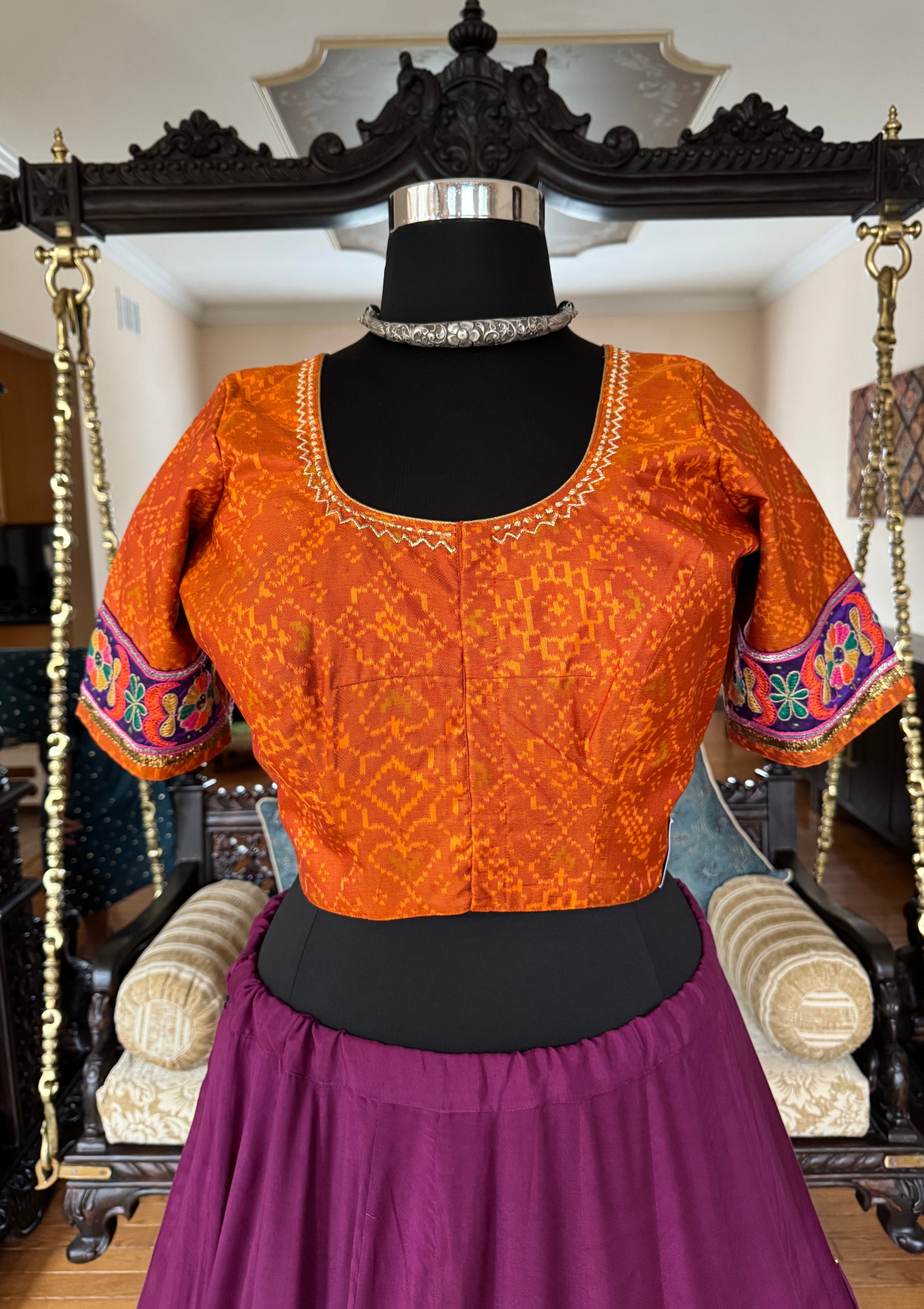 An exquisite Navratri outfit featuring a magenta chaniya with vibrant gamthi border, paired with an orange silk ikat blouse adorned with gamthi detailing and a magenta gamthi dupatta. A perfect fusion of tradition and festive charm.