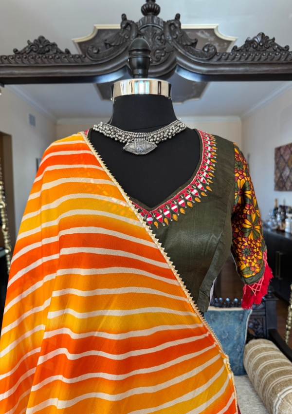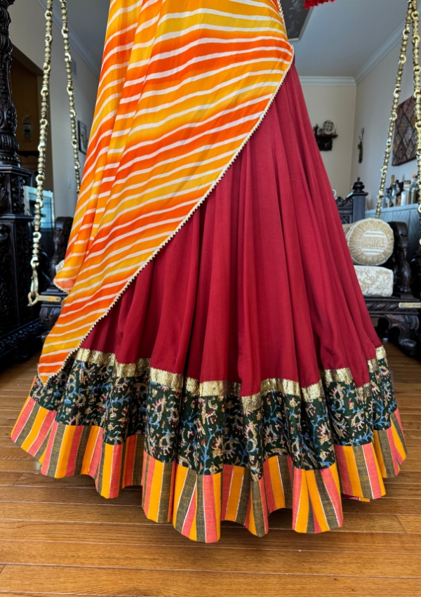 Add festive elegance with this maroon lehenga, olive green embroidered blouse, and vibrant orange striped dupatta. Finished with zari borders and multicolor panels, it’s a stunning choice for Navratri Garba nights.
