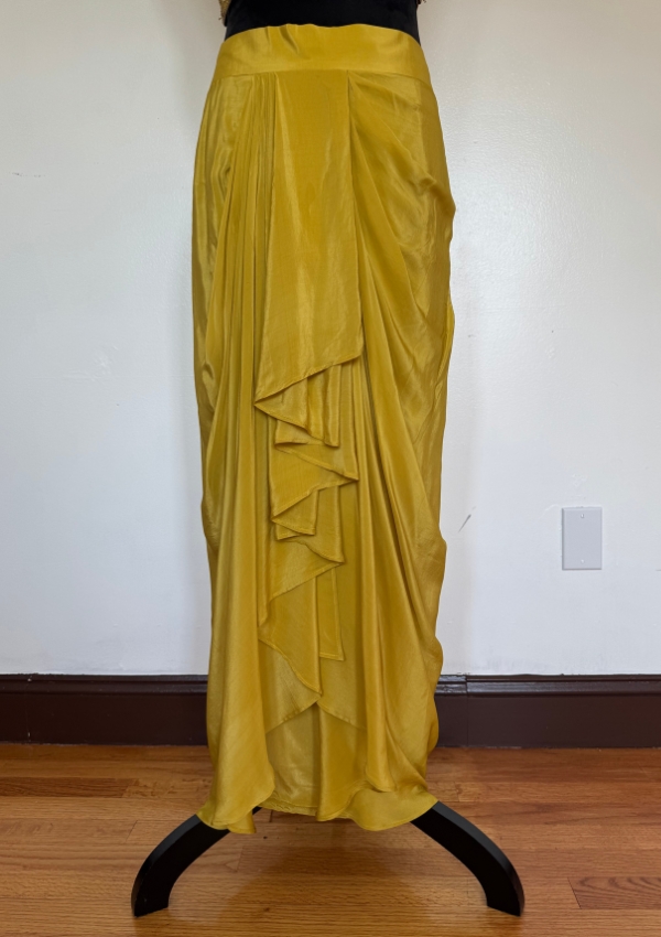 Turn heads with this Mustard Gold Crop Top with Draped Skirt set. The velvet draped skirt adds a contemporary touch, while the embroidered crop top with mirror and thread work enhances its festive elegance. Paired with a matching dupatta, this outfit is a perfect blend of traditional charm and modern style.