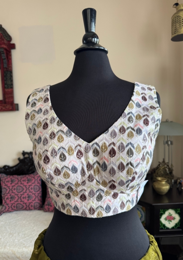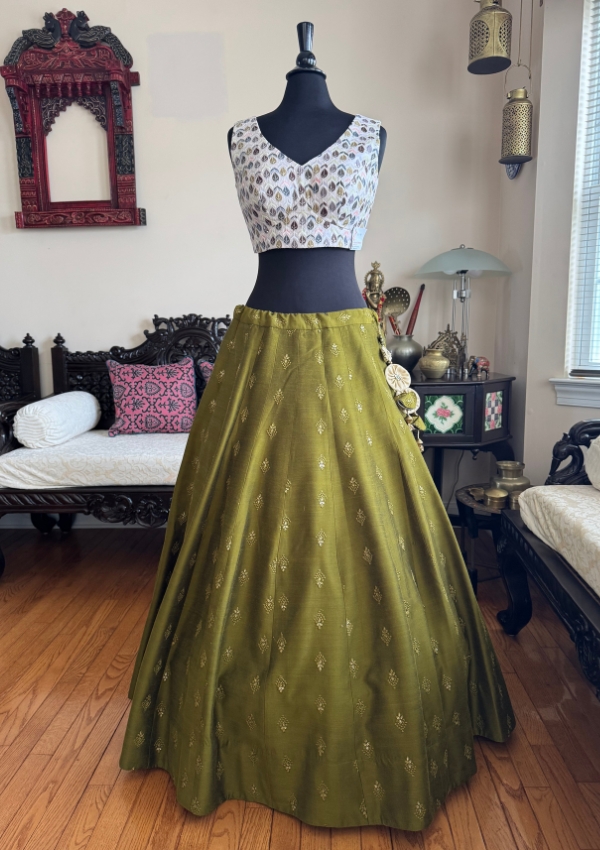 Enhance your wardrobe with this Olive Green Crop Top Lehenga Set. Designed with a silk blend lehenga featuring delicate woven motifs, it pairs beautifully with a sleeveless printed crop top. The soft white dupatta adds a touch of elegance, making this outfit perfect for festive gatherings, weddings, or receptions.