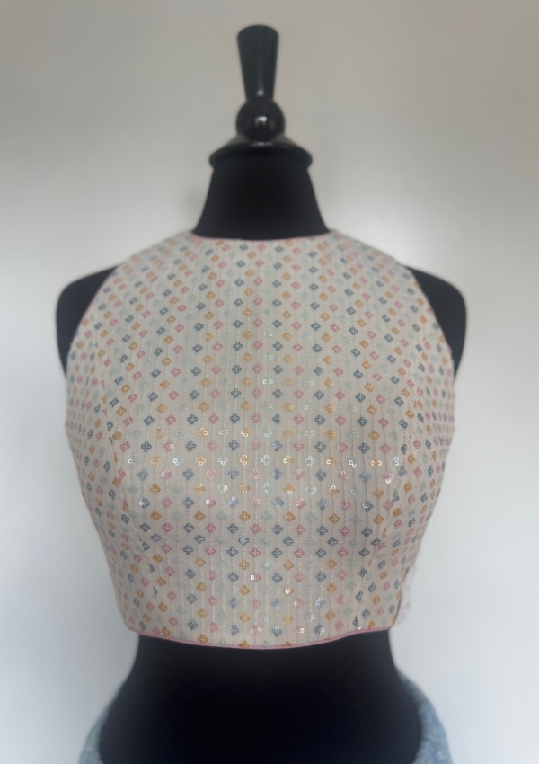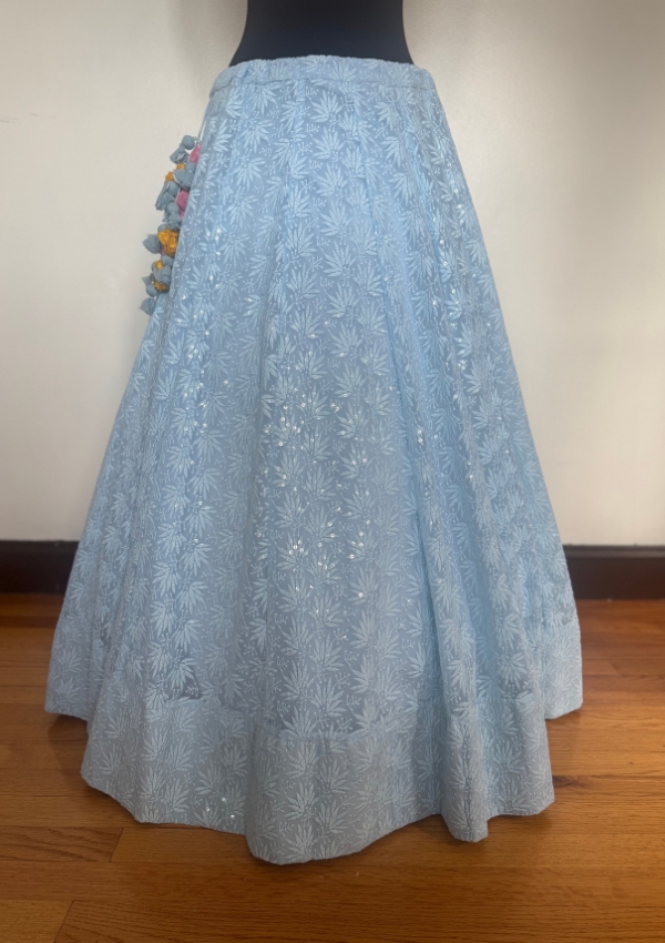 Step into elegance with this Pastel Blue Crop Top with Embroidered Lehenga. The pastel blue lehenga is beautifully adorned with intricate embroidery, paired with a peach printed crop top for a refreshing contrast. A soft multicolor pastel dupatta adds a playful charm, making it a perfect choice for day weddings, festive functions, or modern parties.