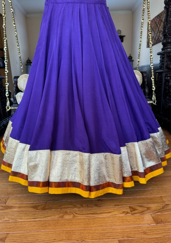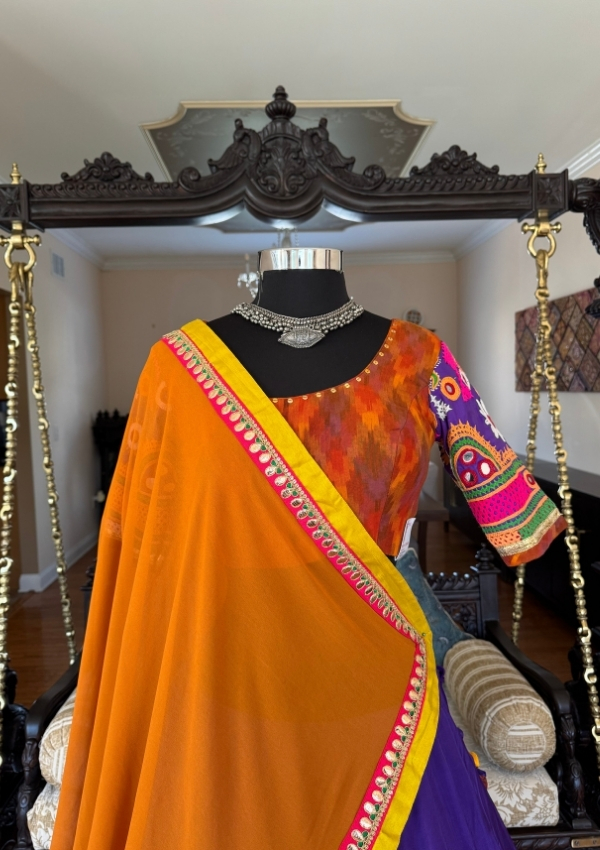 Turn heads this festive season with a Purple Chaniya featuring an 8-meter flare and rich lampi border. Paired with a Rust Ikat Gamthi blouse (sizes 34/36/38) and a matching rust dupatta, this ensemble is the perfect balance of tradition and bold festive elegance.