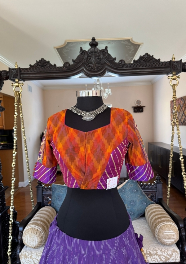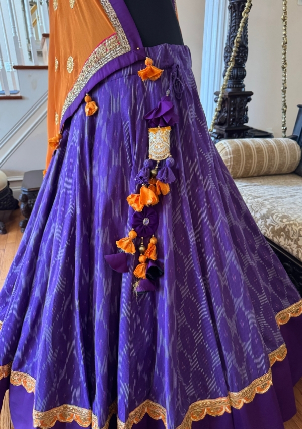 Stand out in style with this Purple Ikat Chaniya, designed with traditional patterns and festive detailing. Paired with a rust Gamthi blouse (sizes 36/38/400) and a bright orange georgette dupatta, this ensemble is the perfect combination of vibrant colors and traditional craftsmanship for Navratri nights.