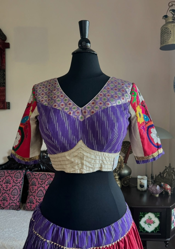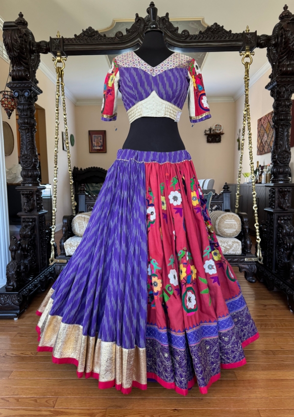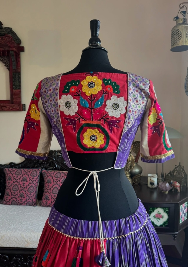 Celebrate Navratri in vibrant style with this purple and red chaniya choli set. Featuring bold floral embroidery, bandhej dupatta, and golden zari border, it blends traditional craft with festive elegance for Garba nights.