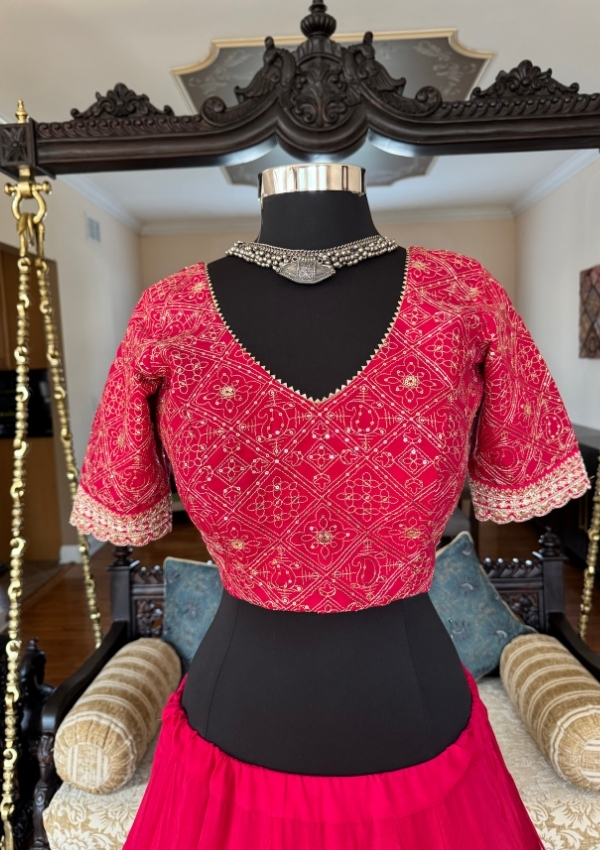 Exude royal elegance with this Rani Chaniya featuring a majestic 8-meter flare and gold block print border. Paired with a dazzling sequin work blouse (sizes 36/38/40) and a regal purple vintage dupatta, this ensemble is a statement piece for Navratri nights and traditional festive occasions.