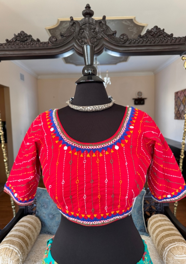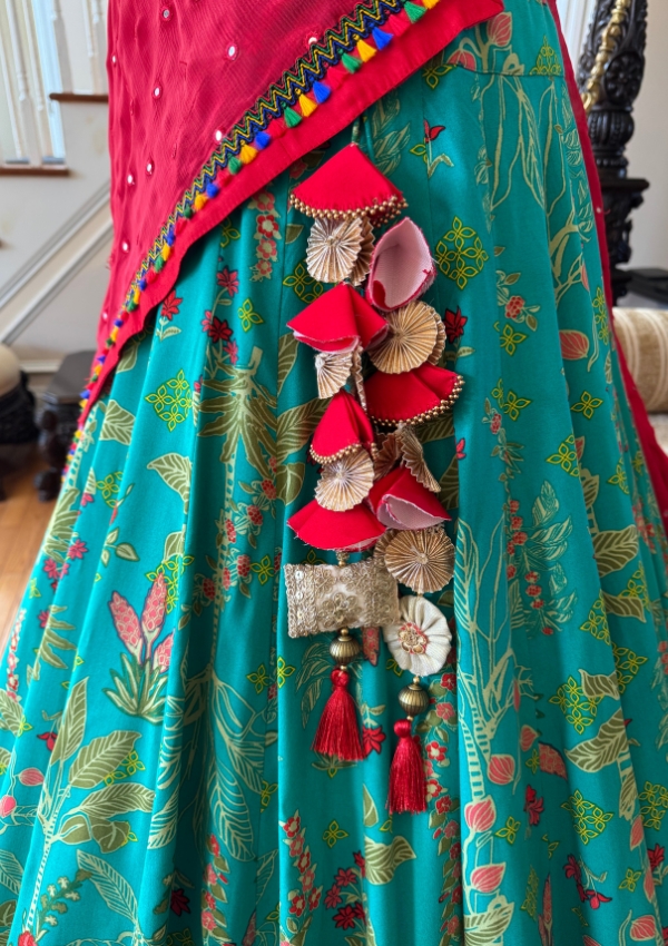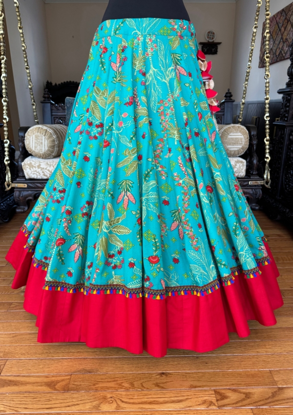 Bring festive charm with this Teal Chaniya featuring a 7-meter flare and traditional floral design. Paired with a red Katha work blouse (sizes 34/36/38) and a red mirror work chinon dupatta, this ensemble perfectly balances vibrant hues and intricate craftsmanship, ideal for Navratri Garba nights.