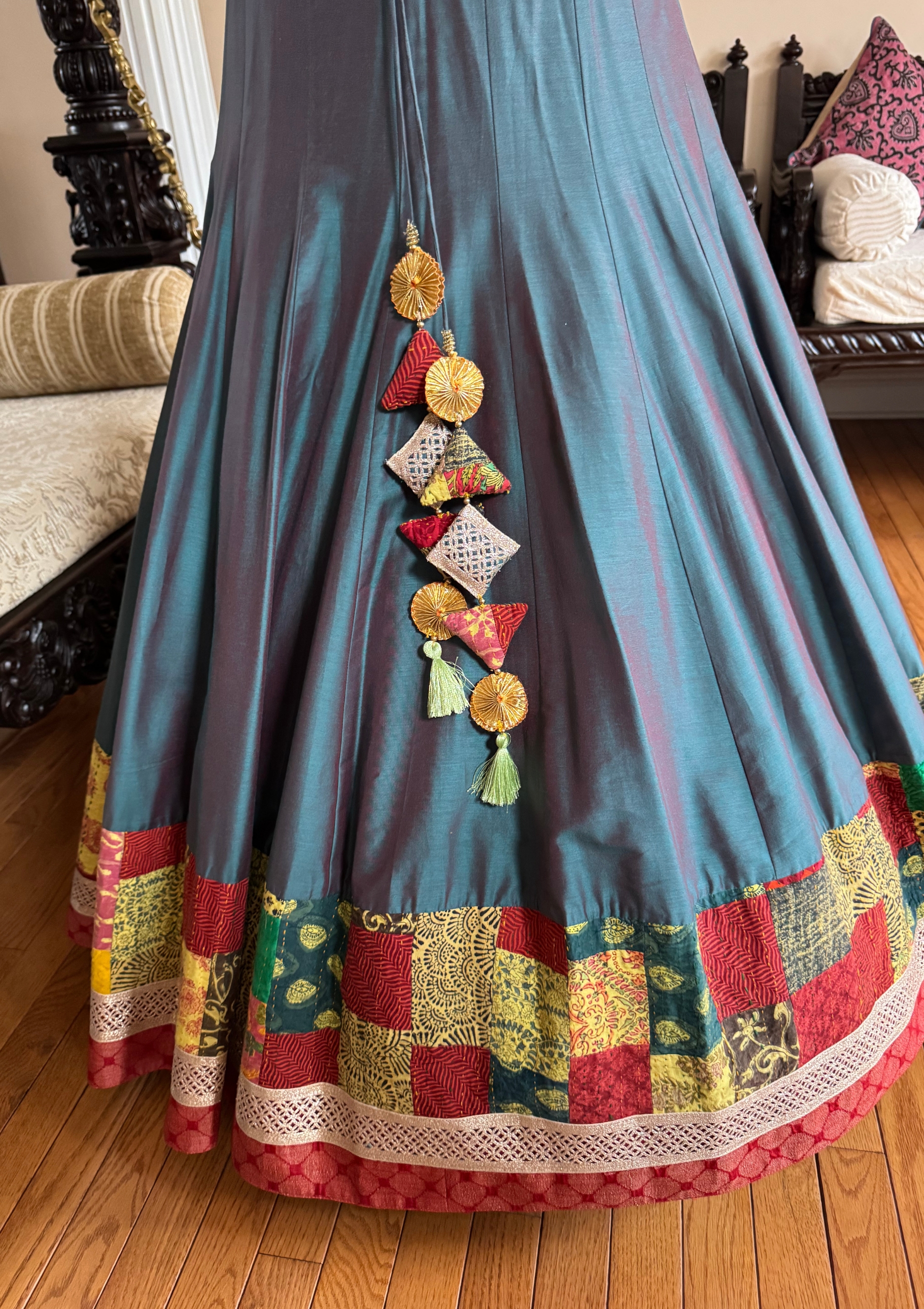 A regal Navratri chaniya crafted in teal silk with a vibrant multicolored patchwork border, paired with a teal Ajrakh embroidered blouse and a striking tomato red dupatta. A perfect mix of traditional design and festive grandeur.