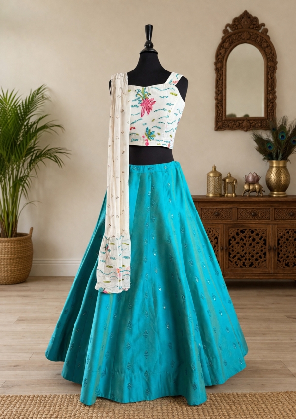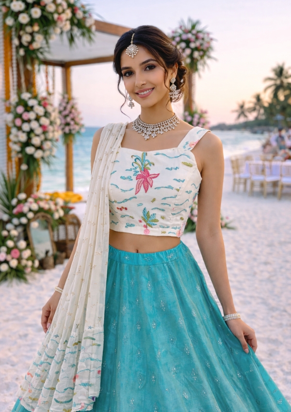 This turquoise raw silk skirt set is paired with an off white sequin and bead embroidered crop top, creating a perfect blend of elegance and sparkle. The look is completed with a soft georgette dupatta featuring delicate floral fringe detailing. Ideal for destination weddings and festive celebrations, this outfit brings effortless charm and sophistication.