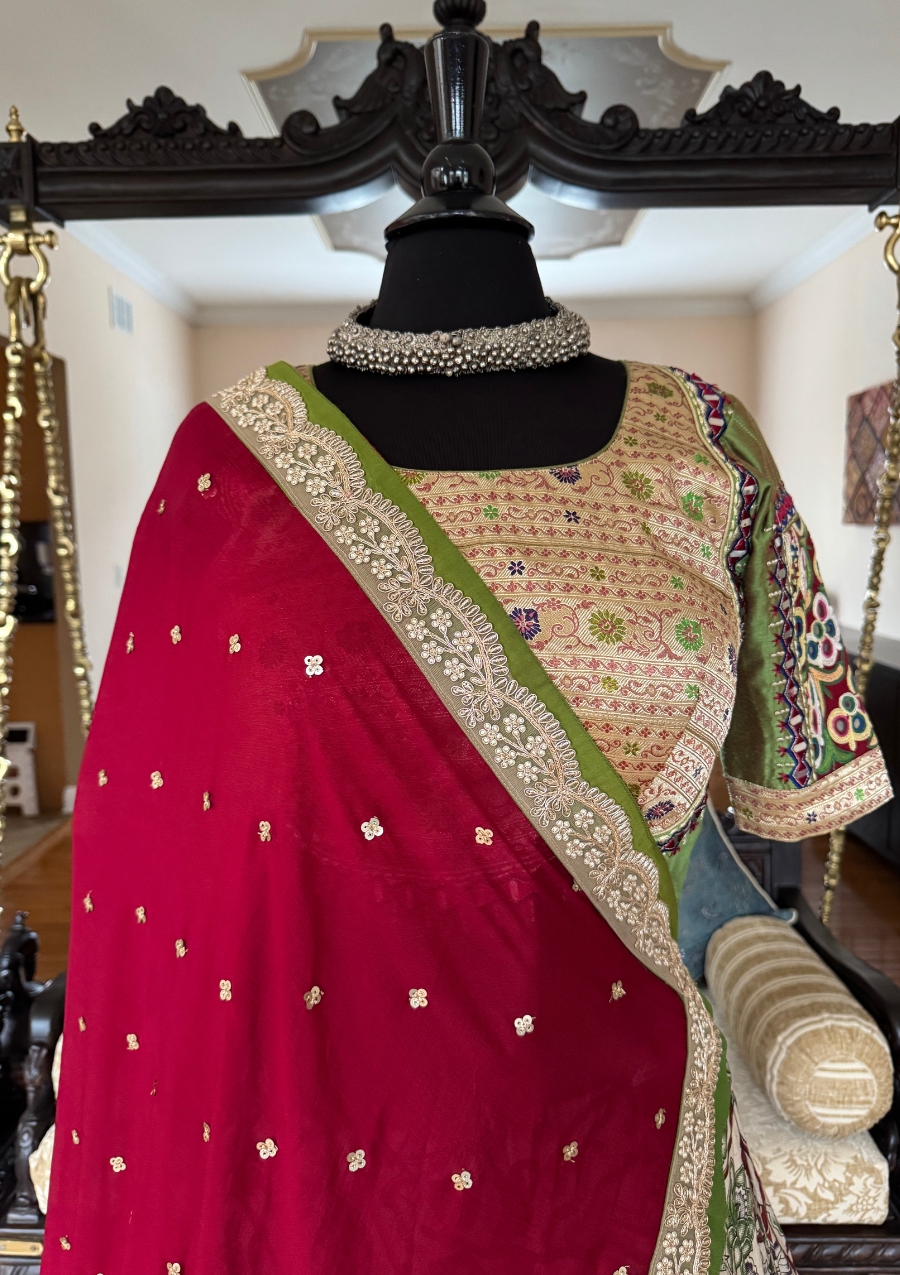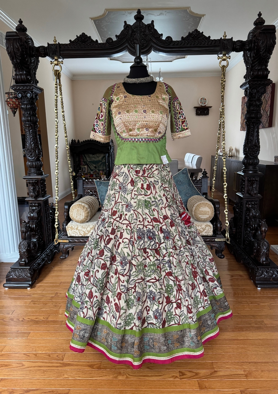 This elegant White Kalamkari Lehenga Set from Indian Ethnics celebrates timeless artistry with a touch of royal sophistication. The lehenga features a graceful kalamkari print detailed with a banarasi vintage border, paired with a green embroidered blouse and a rose pink dupatta adorned with delicate sequin work. A perfect choice for weddings, Navratri, or festive gatherings - where tradition meets modern poise.