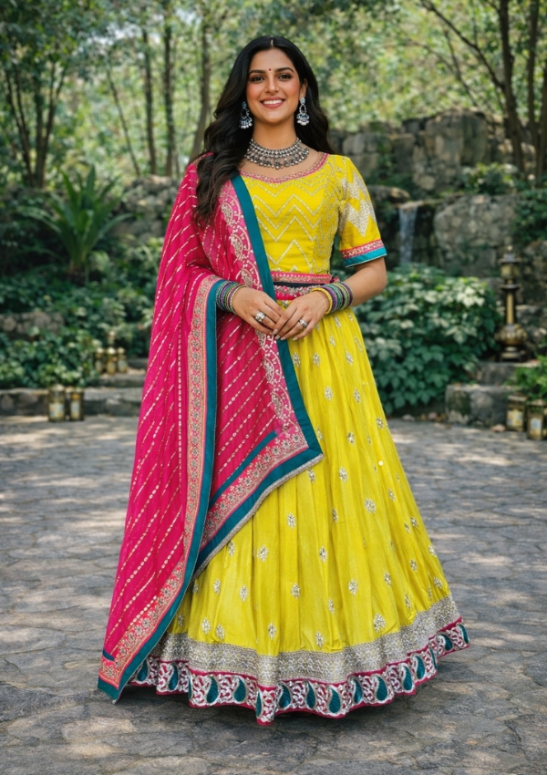 Brighten up your festive wardrobe with this yellow chaniya choli paired with a contrasting pink dupatta. Featuring delicate embroidery and zari border, this ensemble is ideal for Navratri, Garba nights, weddings, and festive occasions.